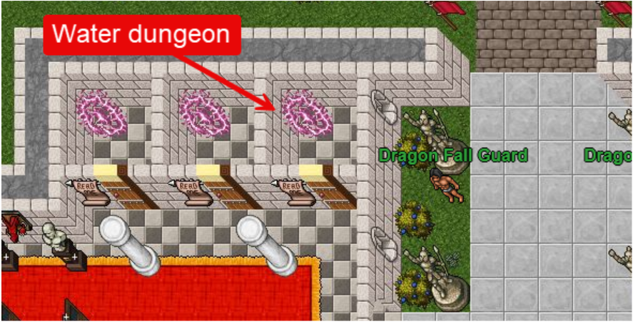 The entrance to the Water Dungeon is located near the north gate of Dragon Fall, inside the building on the west side of the road.